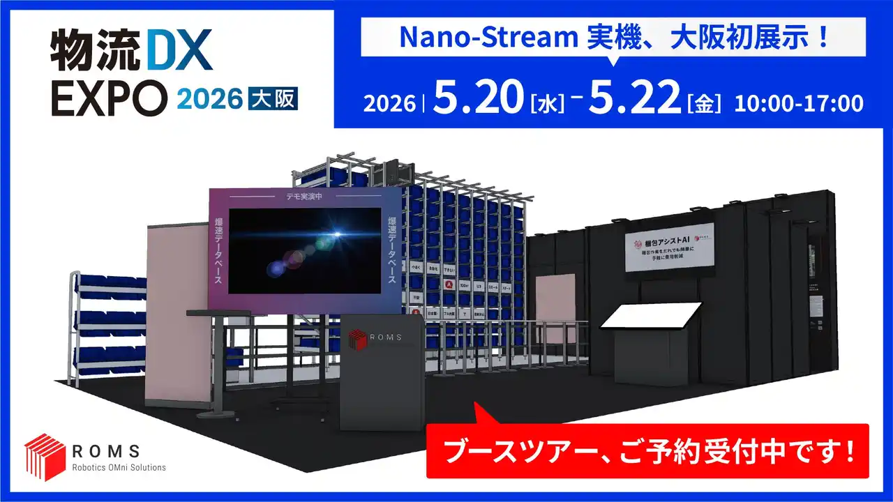 ROMSは、小型自動倉庫『Nano-Stream(ナノ・ストリーム)』の実機展示と、梱包作業時の箱サイズ選定の悩みをゼロにする『梱包アシストAI』のご案内を実施します。ご来場の際はぜひ、弊社ブースへお立ち寄りください。 |