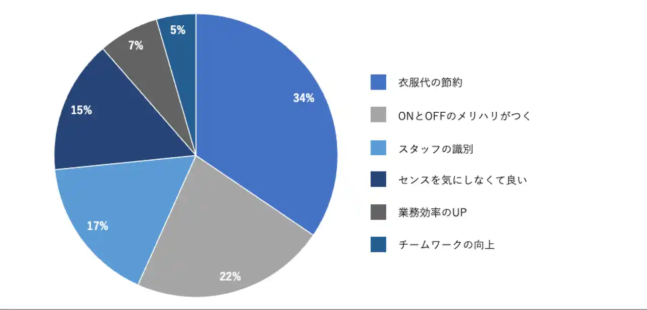 また、「服装のセンスを気にしなくてよい」という声があるように、服装に対する周囲からの指摘や評価、いわゆる“服装ハラスメント”の防止にも寄与していることが分かりました。 |