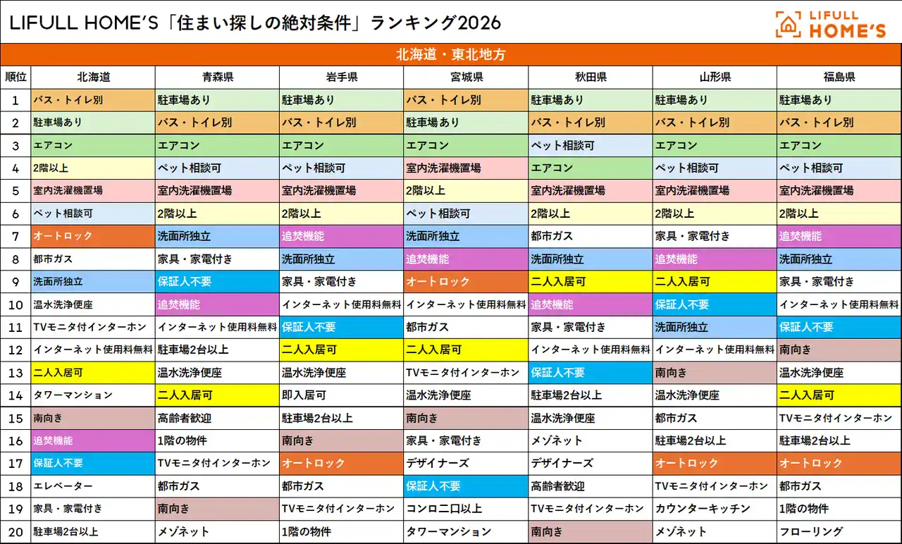 LIFULL HOME'S「住まい探しの絶対条件ランキング2026」北海道・東北地方 |
