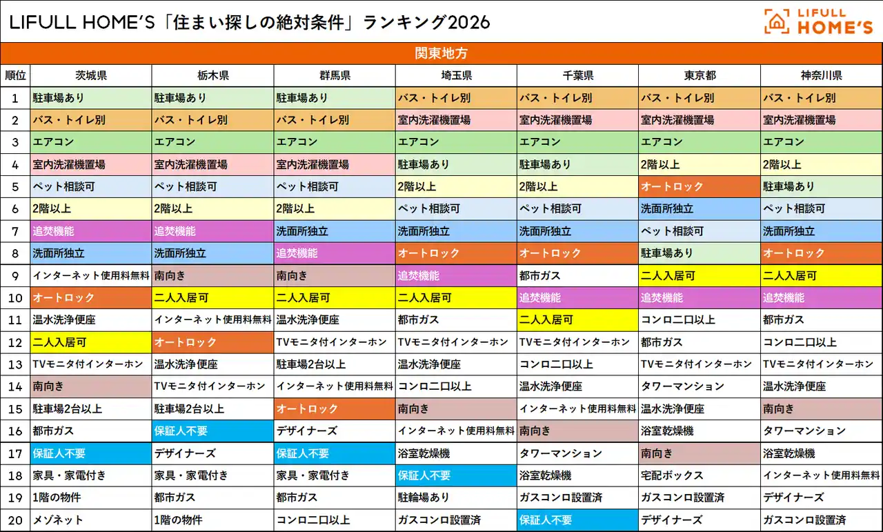LIFULL HOME'S「住まい探しの絶対条件ランキング2026」関東地方 |