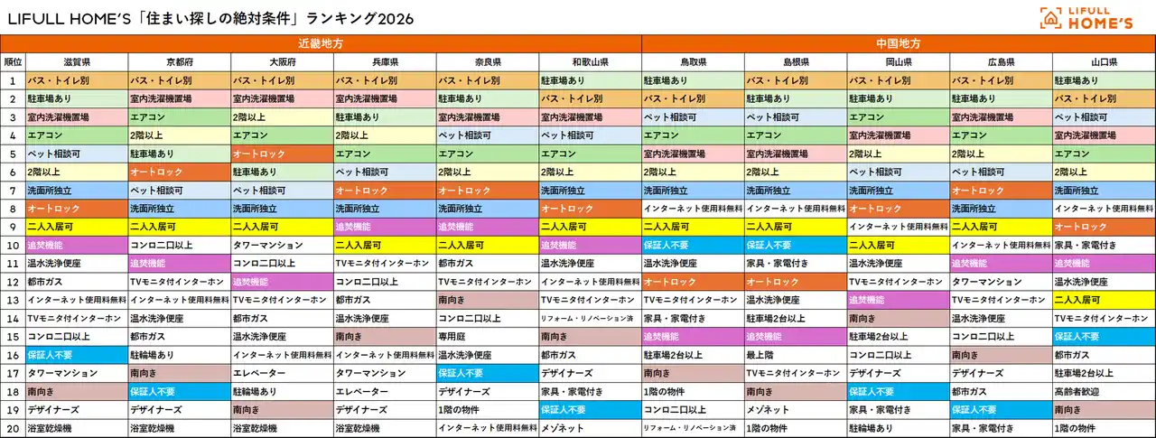 LIFULL HOME'S「住まい探しの絶対条件ランキング2026」近畿地方_中国地方 |