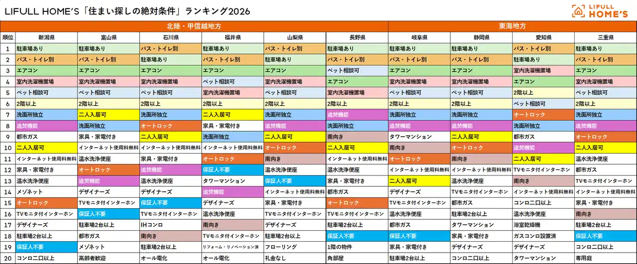 LIFULL HOME'S「住まい探しの絶対条件ランキング2026」北陸・甲信越地方_東海地方 |