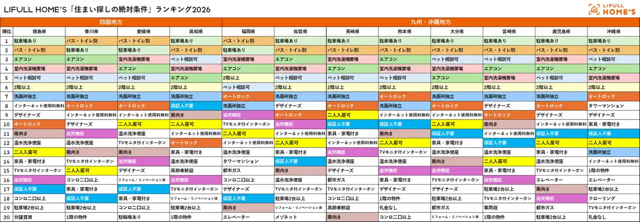 LIFULL HOME'S「住まい探しの絶対条件ランキング2026」四国地方_九州・沖縄地方 |