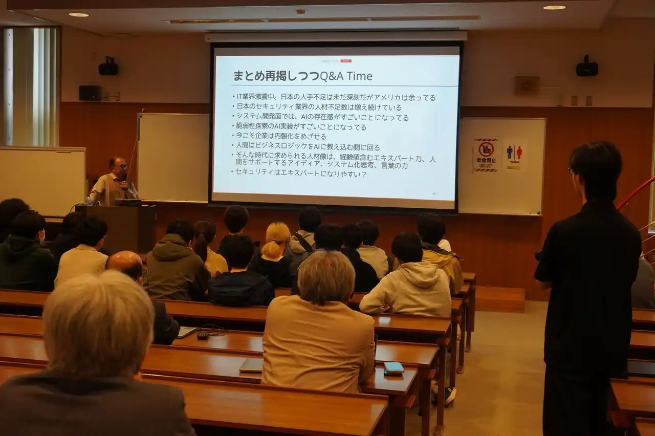 NICTナショナルサイバートレーニングセンター長園田氏の講演/学生との質疑応答の様子 |