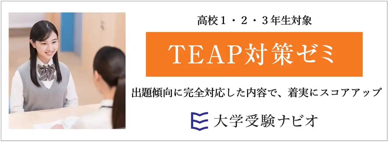 株式会社増進会ホールディングス(Z会グループ)のグループ会社、株式会社栄光(本社:東京都千代田区 代表取締役社長:下田勝昭)が運営する大学受験専門塾「大学受験ナビオ」は、高校1・2・3年生を対象に、「TEAP対策ゼミ」を2027年2月まで開講しています。【映像授業】【添削指導】【面接指導】を組み合わせた講座で、大学入試で活用されている英語資格試験「TEAP」のスコアアップを目指します。 |