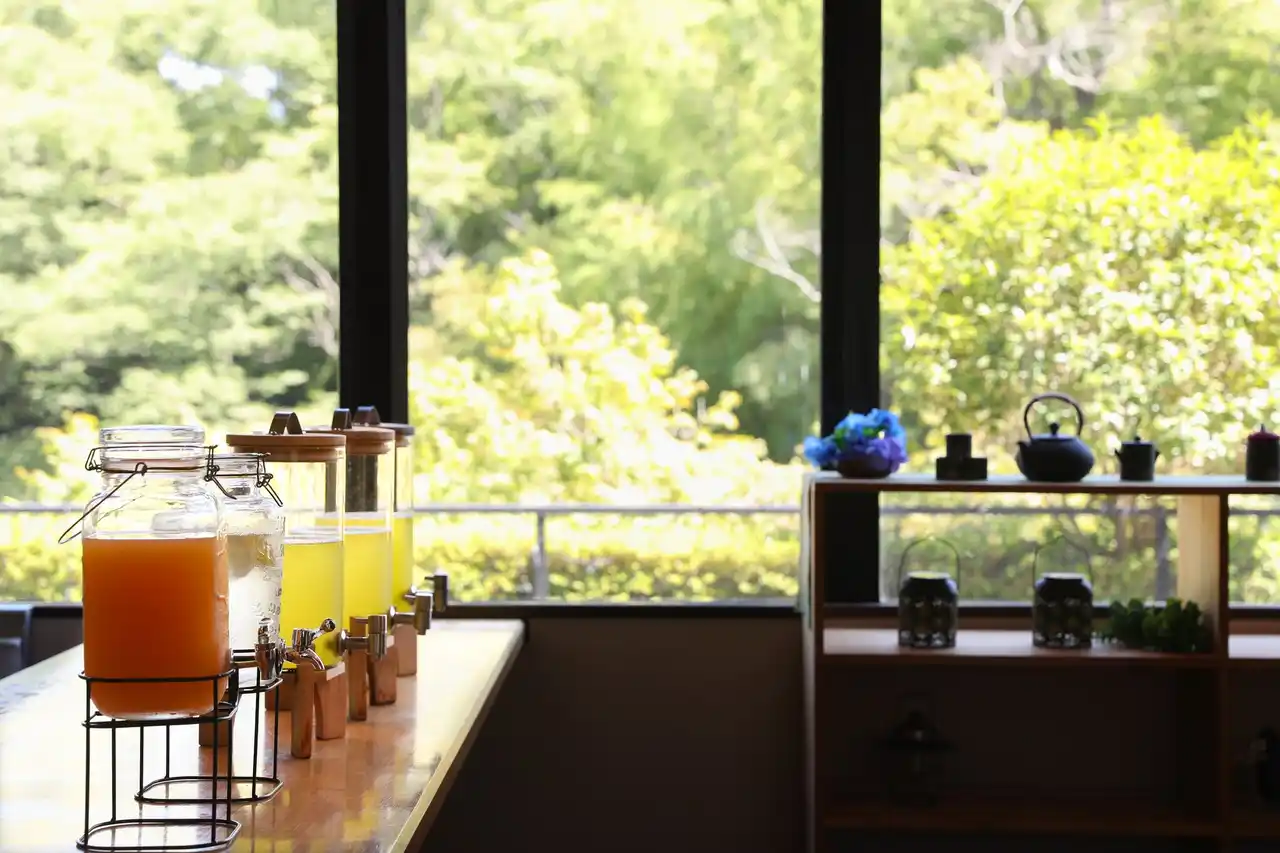 チェックイン時間前からご利用可能なプレミアムバーでは、アルコール・ソフトドリンクを始めご当地スナック等も合わせてご提供しております。渓流に面した木々に囲まれた「テラスラウンジ」や「さとやまビューのお部屋」など非日常に浸る空間で上質な時間をお楽しみ下さい。 |