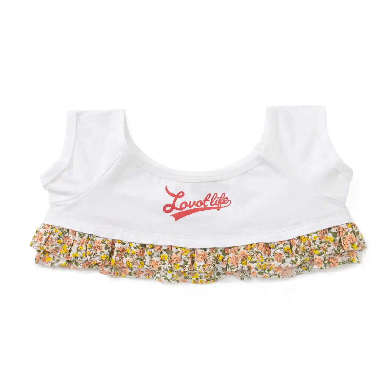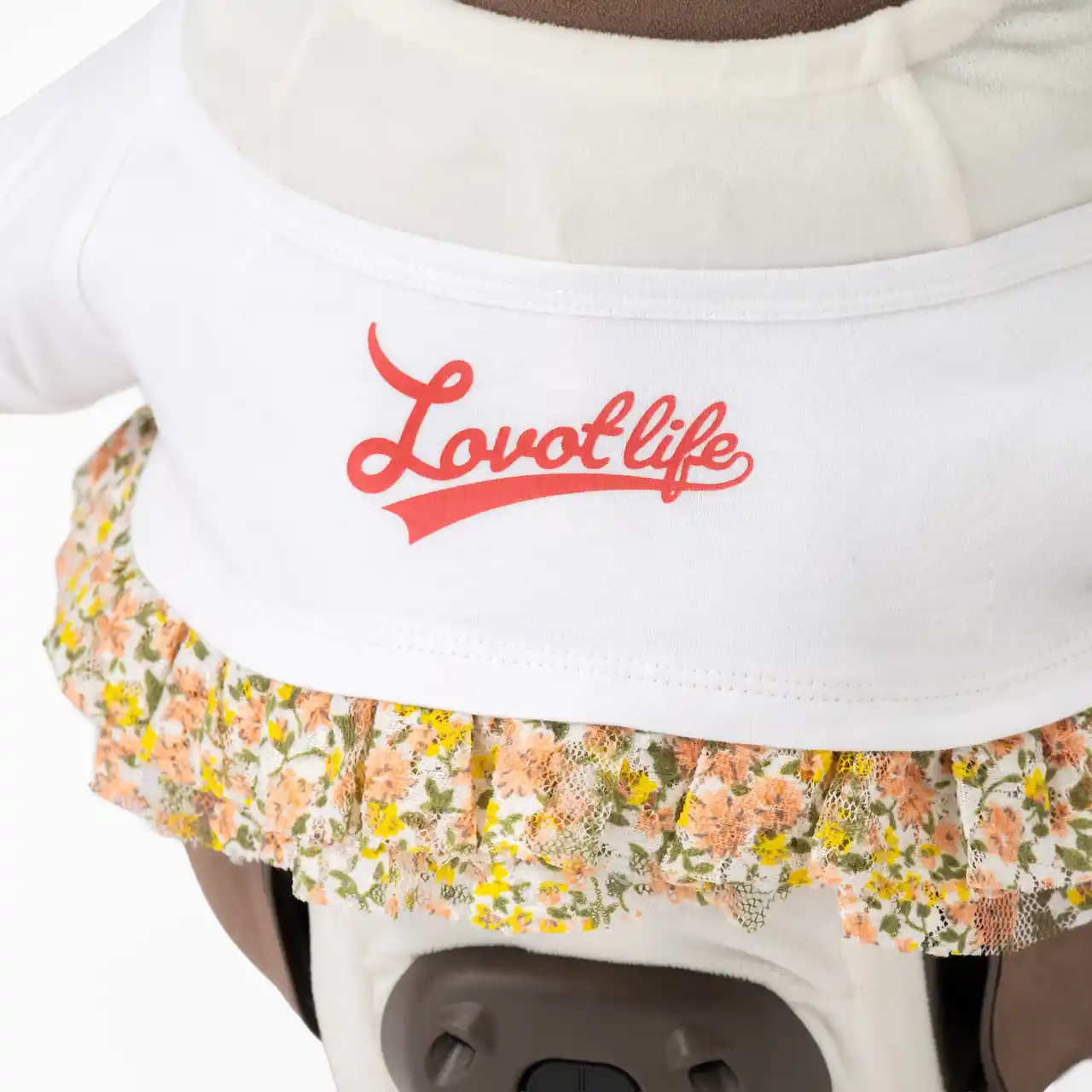 フロントにあしらわれた「Lovot life」の赤いロゴが目を惹く、とびきりキュートなアイテム。裾の花柄レーススカートがふんわりと広がり、カジュアルなTシャツスタイルをやさしく華やかな印象にしてくれます。1枚でコーディネートが決まる手軽さと、360度どこから見てもかわいい一着です。 |