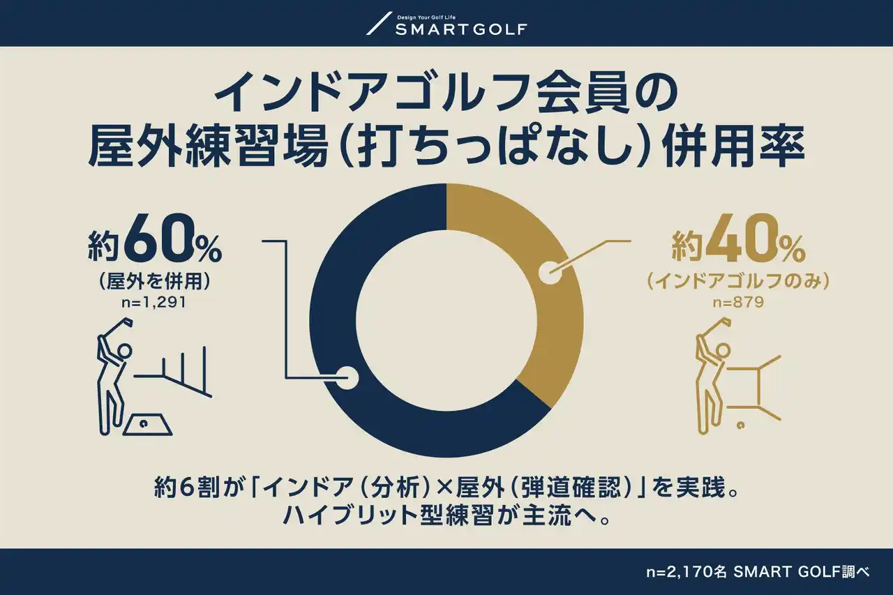 ITを活用した定額制・完全会員制インドアゴルフ練習場「SMART GOLF(スマートゴルフ)」を運営し、インドアゴルフ業界トップクラスの施設数を誇る株式会社SMART GOLF(本社:東京都渋谷区、代表取締役:高須賀優人)は、自社会員を対象とした利用実態調査(有効回答数:2,170名)を実施いたしました。 本調査により、現代のゴルファーが「インドア」と「屋外」を対立構造として捉えるのではなく、それぞれの強みを合理的に使い分ける「ハイブリッド型」の練習をスタンダードとしている実態が明らかになりました。 |