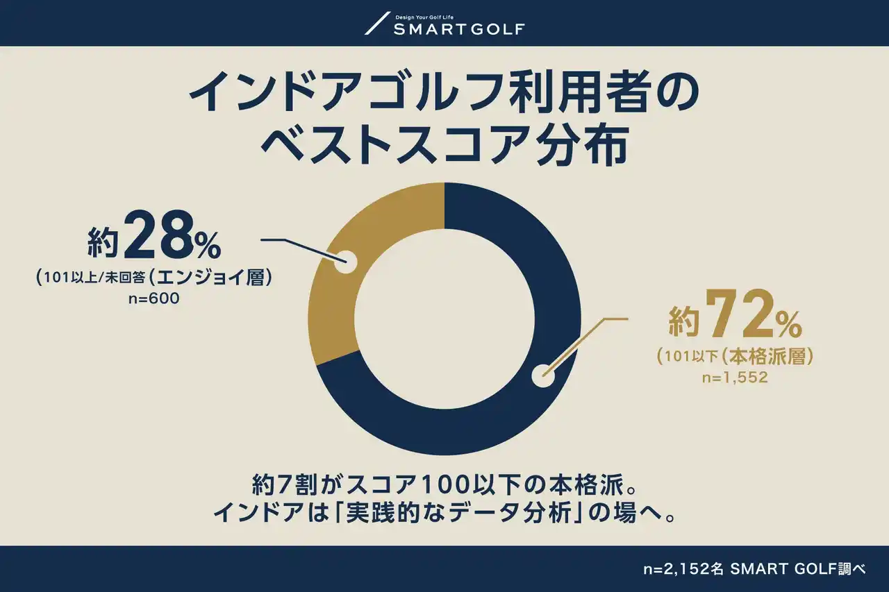 | 利用者のスコア分布を分析したところ、回答者の7割超(71.5%)がベストスコア100以下の「中上級者・本格層」であることが判明しました(内訳:スコア80以下が16.6%、81~100が54.9%)。彼らがインドア施設を選ぶ最大の理由は「妥協」や「単なる快適さ」ではありません。24時間いつでも利用できるタイムパフォーマンスの高さに加え、弾道計測器やAIによる「スイングの数値化・客観視」を求めています。本気で上達を目指すゴルファーにとって、インドア施設は自らのスイングを客観的に分析し、効率よくスイング構築を行うための「実践的なデータ分析の場」として定着しつつあります。 | |||||||