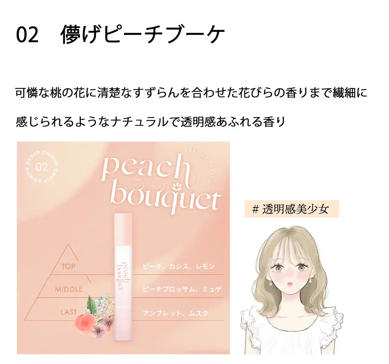 自分らしさやその日のファッション、なりたい姿に合わせて、繊細なニュアンスの違いを使い分けられる「ピーチの香り」のコレクションです。 |