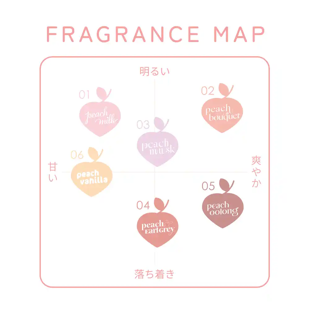 展開する桃の香りは全部で6種類。「ピーチ×ミルク」「ピーチ×ブーケ」といった組み合わせに加え、製品名には「あざとピーチバニラ」「お上品ピーチアールグレイ」など、香りの印象をプラスしました。 |