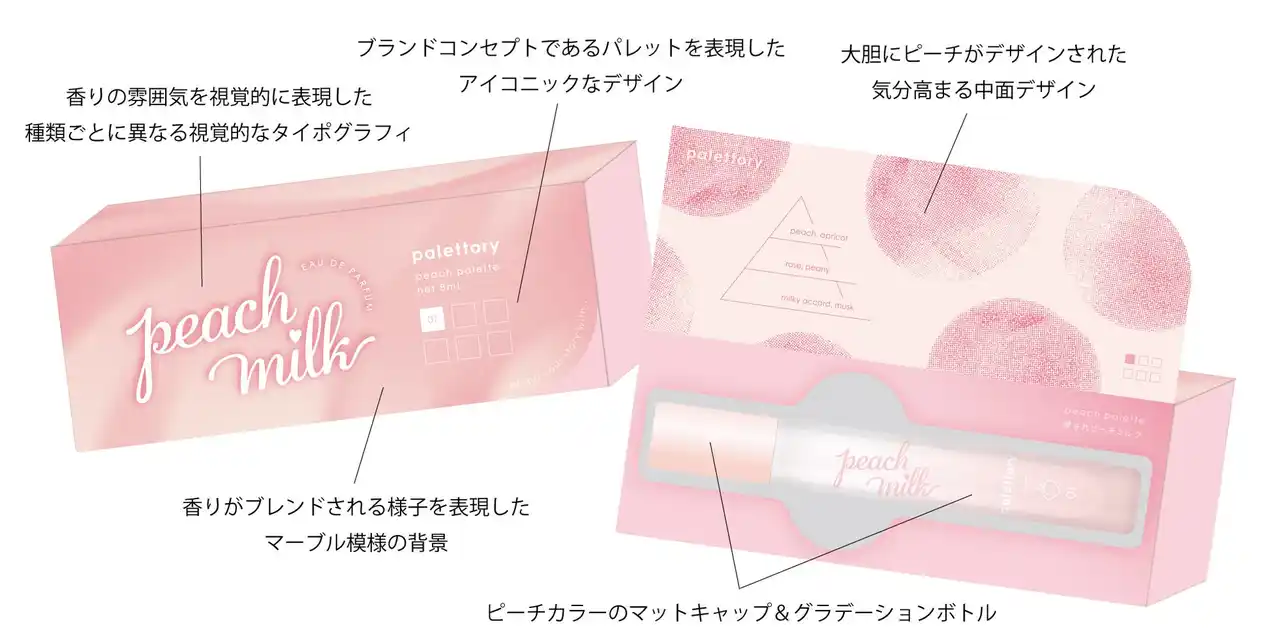 デザインは、ブランドコンセプトを体現したメイクパレットのように開くパッケージに、ピーチの質感を感じるマット加工を施したピンクのキャップとボトル。香りごとに異なるフォントを採用し、その世界観を視覚でも表現しました。 |
