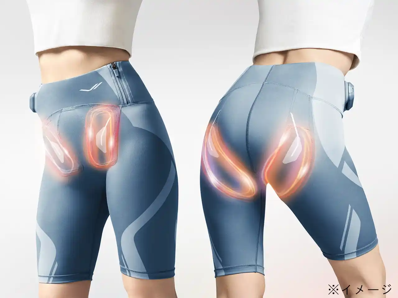 これまでのSIXPADのEMS製品に比較して、電極に厚みがあるのが特徴です。この厚みによってどんな姿勢でもしっかりと筋肉に刺激が届く設計にしました。また、ハイウエストで裾の長いデザインにすることで、着用時のフィット感を向上しました。 |