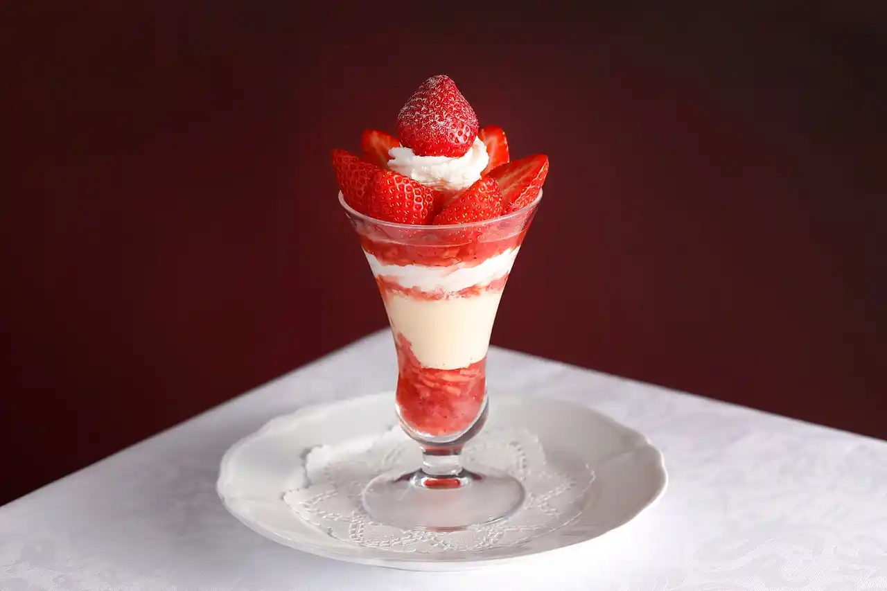 宝石のルビーを思わせる光沢のある赤色が特長の苺を贅沢に使用したパフェです。香り高く、甘味と酸味のバランスに優れた味わいをお楽しみください。 |