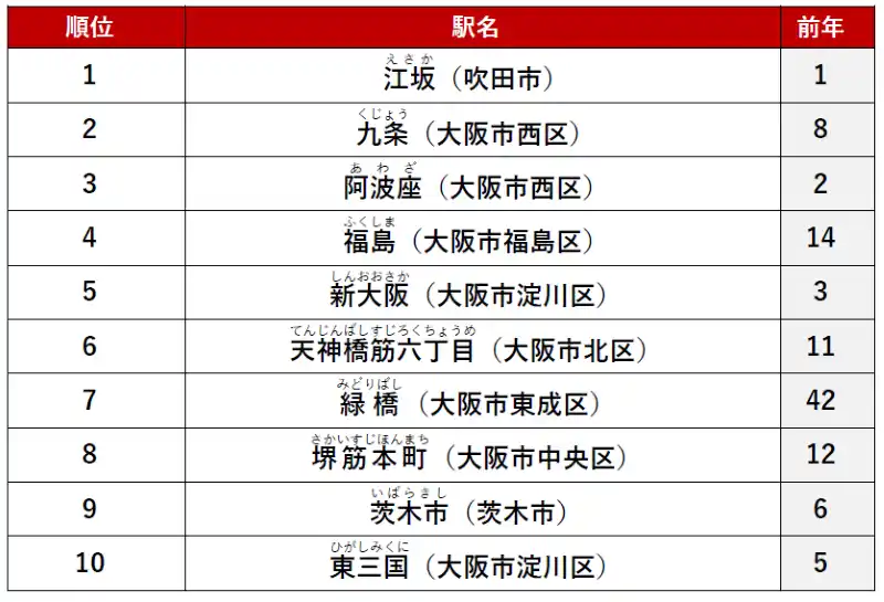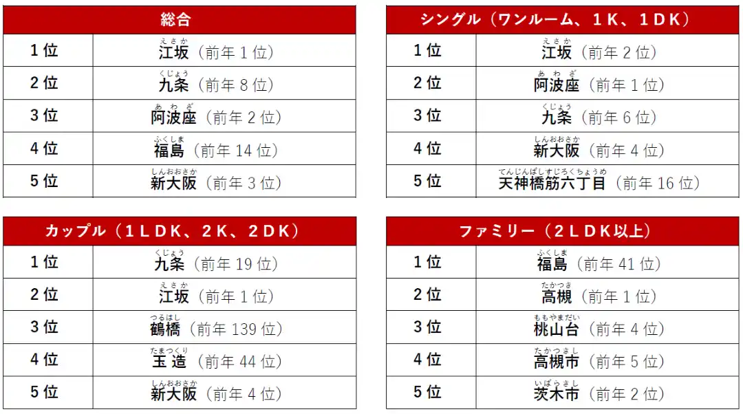 総合1位は前年に引き続き「江坂」駅でした。ファミリータイプでは「福島駅」が大躍進の1位に。再開発が進む「うめきたエリア」にもほど近く、期待感の高まりがうかがえます。 |