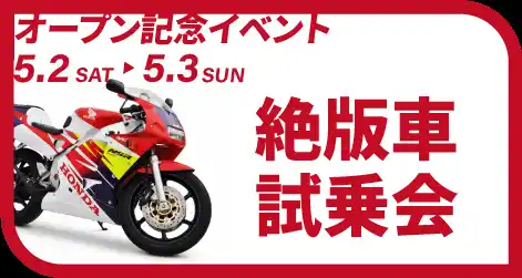 今回、オープニングイベントとして、豪華景品が当たる抽選会のほか、希少な絶版車の試乗会、特選車販売や期間中に当店舗で126cc以上のバイクをご購入された方を対象にVポイントを進呈するキャンペーンを実施します。ベテランライダーの方はもちろん、これからバイクに乗り始める方やご家族にも楽しんでいただける企画をご用意して皆様のご来店をお待ちしております。 |
