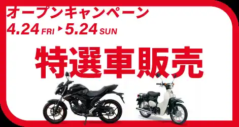 当店舗では4月24日(金)~5月24日(日)の期間、数量限定の特選車を特別価格にて販売いたします。バイクの購入を検討されている方に、車両を比較・検討いただける機会としてご活用いただけます。 |