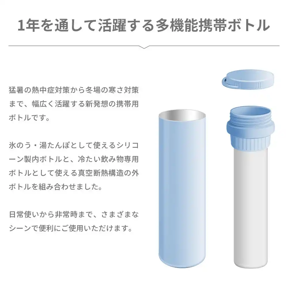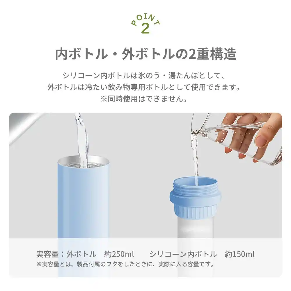 | たんぽとして使えるシリコーン製内ボトルと、冷たい飲み物専用ボトルとして使える真空断熱構造の | |||