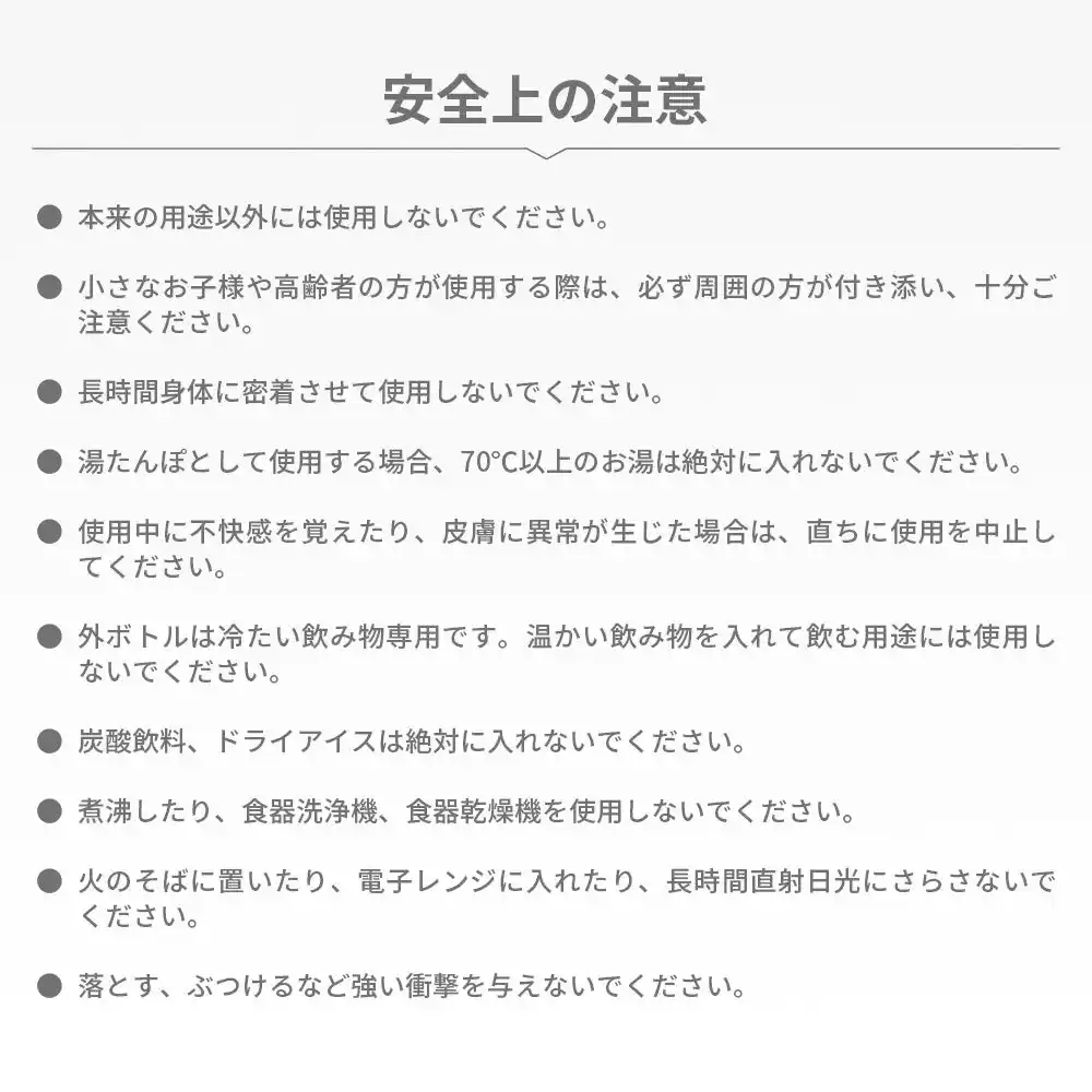 | 氷のう・湯たんぽ・冷たい飲み物専用ボトルとして使える 1本3役。普段使いから、熱中症対策、冬の温活ケアまでしっかりサポート。 |