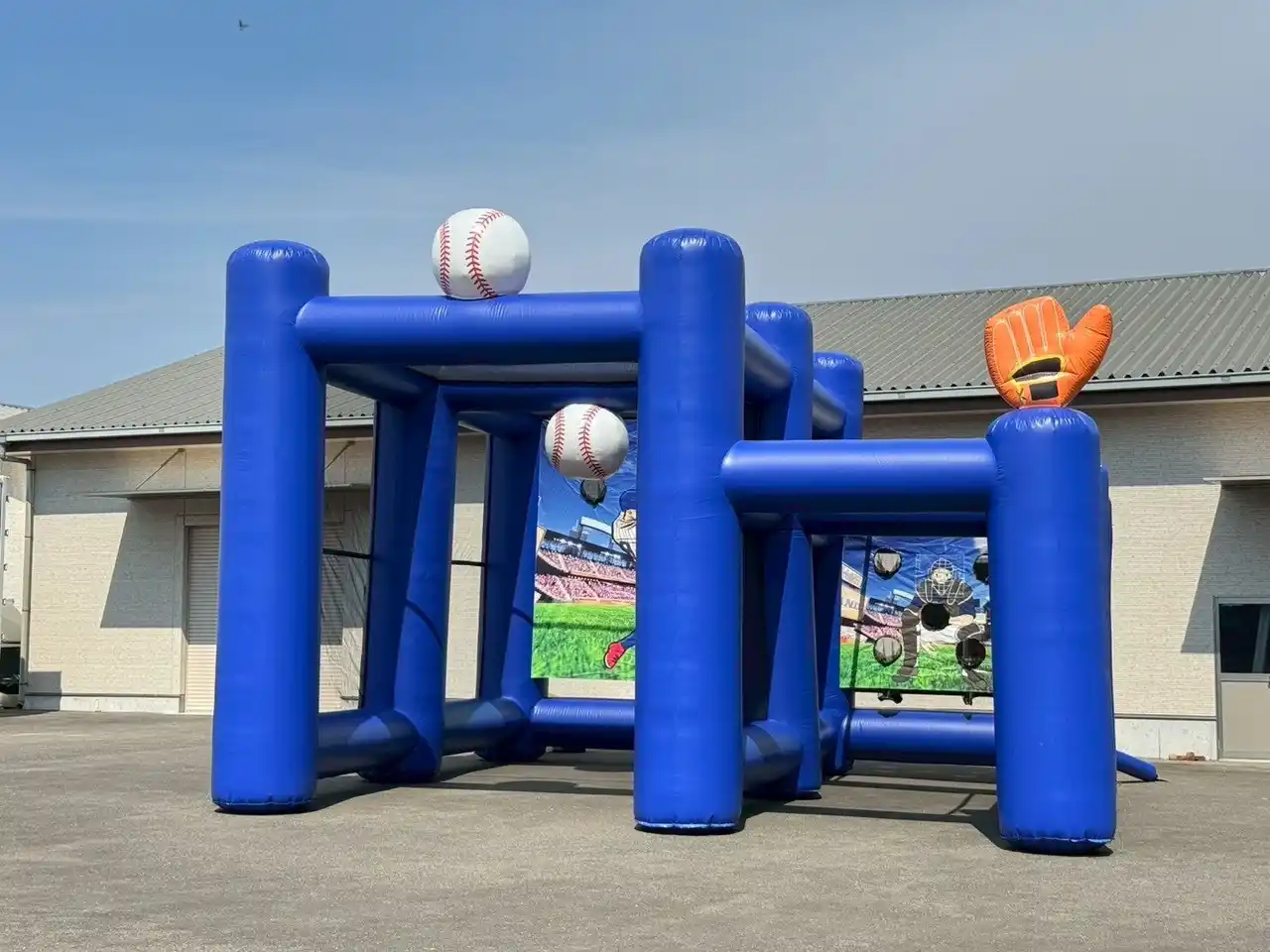 野球ボールを持ち、青いユニフォームを着たキュートな犬のデザインが目を引く、ドーム型の巨大フワフワ(エア)遊具です。 |