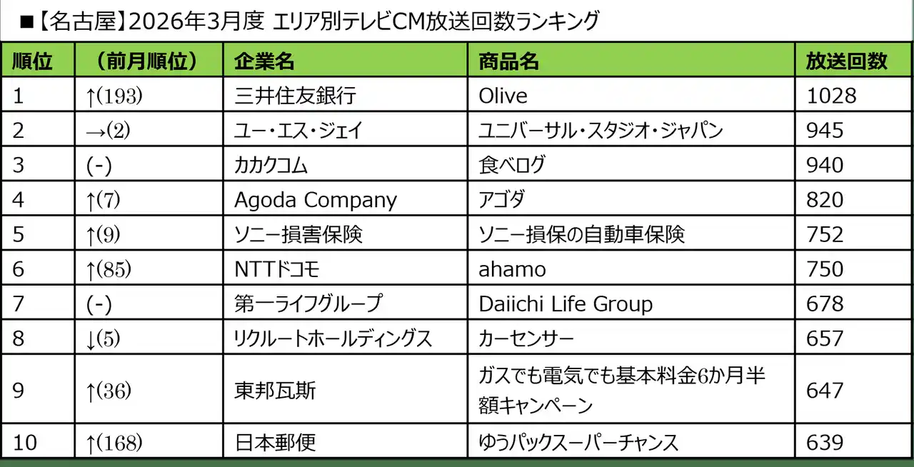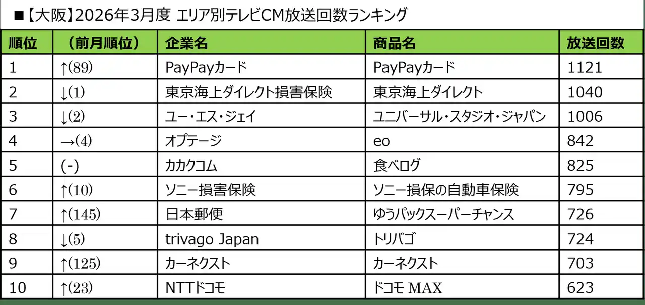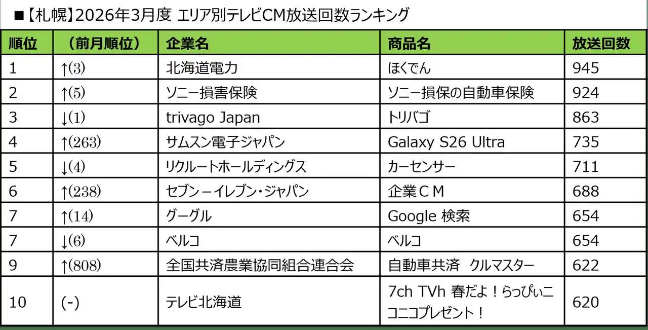 ■2026年3月度 エリア別テレビCM放送回数ランキング |