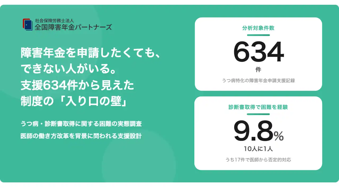 うつ病特化の障害年金申請支援専門として2,500名超の支援実績を持つ、社会保険労務士法人 全国障害年金パートナーズ(東京都千代田区、代表:宮里竹識)は、自社が保有する「お客様の声」634件の支援記録を分析したところ、62件(9.8%)が診断書の取得に何かしらの困難を経験していたことが明らかになりました。さらにそのうち17件では、医師・医療機関から診断書作成を断られるケースも見られました。 |