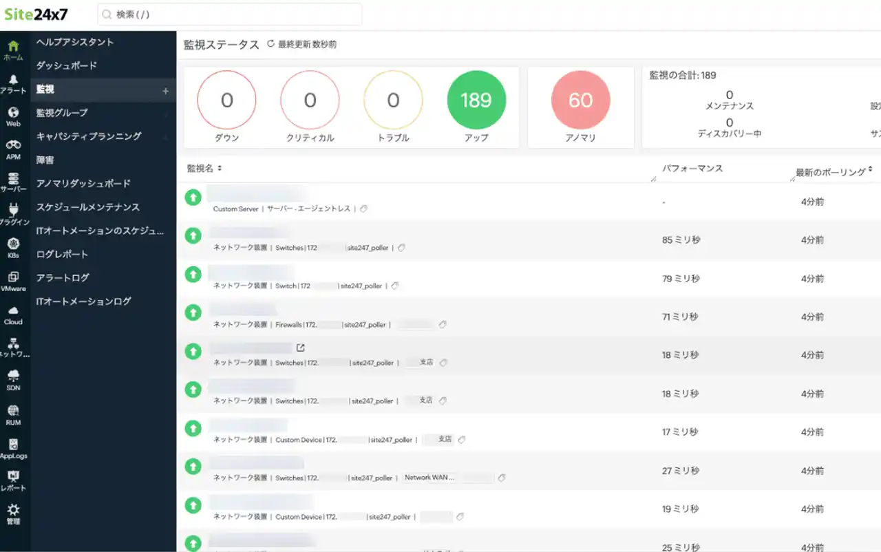 導入後は、9拠点・約80台のネットワーク機器を対象に、1分間隔で死活監視を行う体制を構築し、ネットワーク監視運用の属人化解消を実現しました。また、Site24x7はWebサイト、サーバー、クラウド、アプリケーションパフォーマンスなど幅広い対象の監視に対応しており、将来的な監視範囲の拡張も見据えることができます。 |