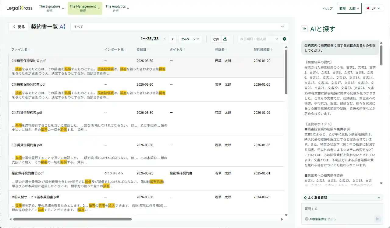 | 本機能は、従来のキーワード検索では難しかった抽象的・文脈依存型の質問に対し、チャット形式で即座に回答および該当契約書の抽出を行うものです。これにより、契約書の検索・把握にかかる工数を削減し、契約管理業務の効率化を支援します。 | ||||||||||||||||