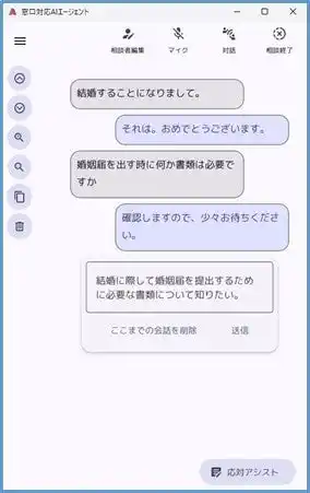 「窓口AIエージェント(仮称)」は、来庁者と窓口職員の会話を音声認識で取込み、煩雑な操作なしで職員に適切な情報を提示する伴走型のAIエージェントシステムです。職員の知識やスキルをタイムリーに補い、適切な手続きや処理方法のご案内など、来庁者へのスムーズな対応を支援します。 |