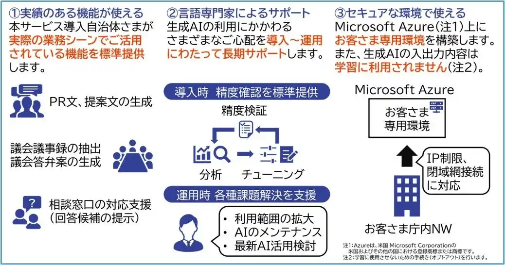昨今、自治体職員のみなさまから、「話題の生成AIで業務を効率化したい。これまでに蓄積されたナレッジをうまく活用できないだろうか」といった声を多く聞くようになりました。しかし、実際の業務で生成AIを使うにはさまざまな疑問や不安があります。 |