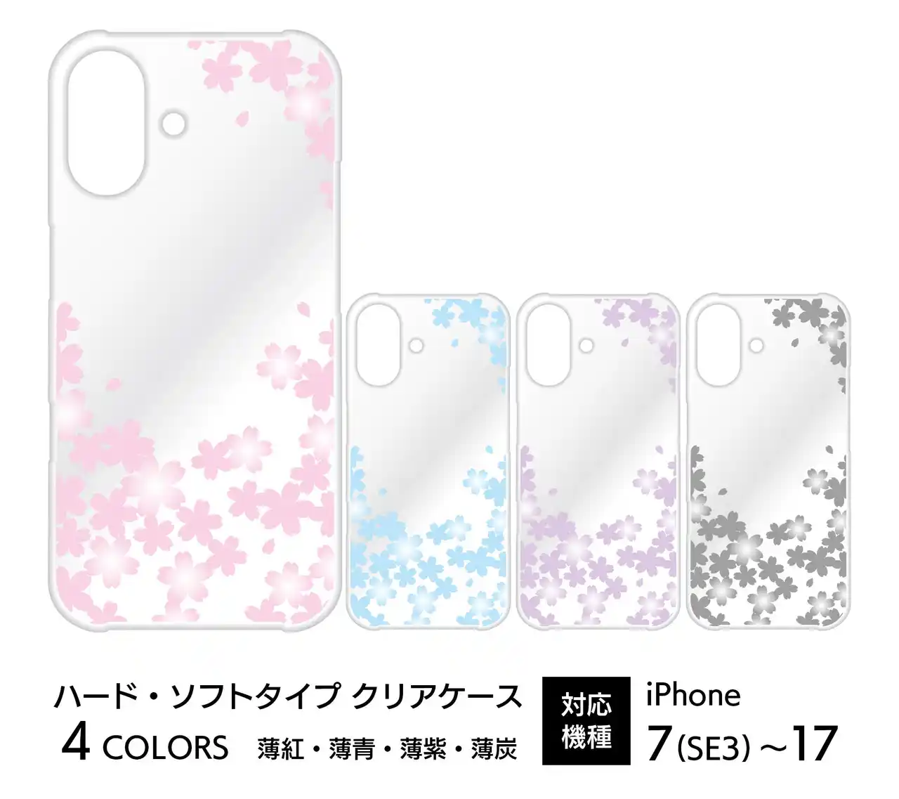 クリアケースの特性を最大限に活かし、iPhone自体のカラーと桜の影が重なり合うことで完成するデザインとなります。お使いの機種の色によって、夜桜のような深みや、春の陽光のような軽やかさなど、異なる表情を見せて楽しむことができます。 |