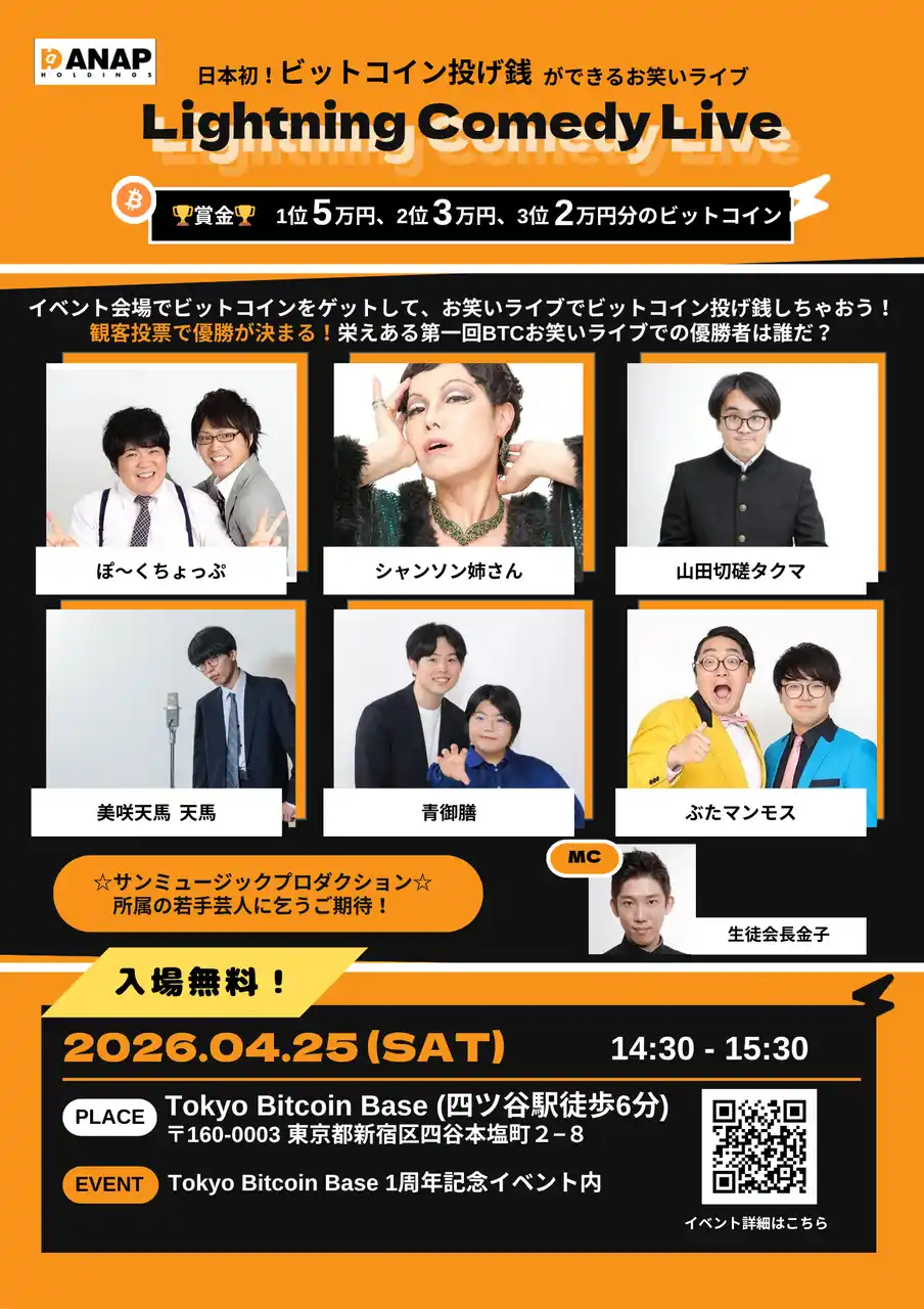 | ANAPホールディングスは、本イベント内で、イベント内プログラムとしてダンスバトルとお笑いライブを開催いたします。これはビットコインによる投げ銭ができるエンタメイベントとしては日本初*の取り組みです。 | ||||||||||||||||||