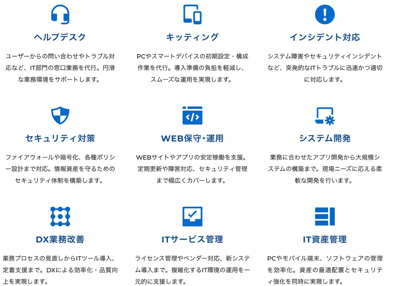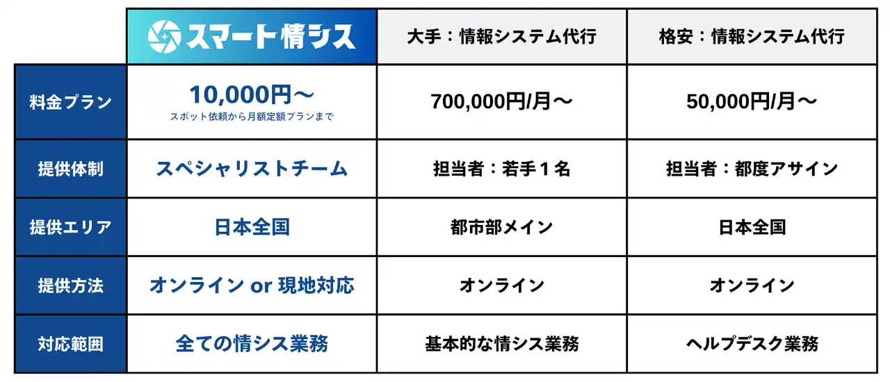 あらゆる情報システム業務をまるっとスマートにおまかせいただくことで、 他サービスと比較して高いコストパフォーマンスが期待できます。 |