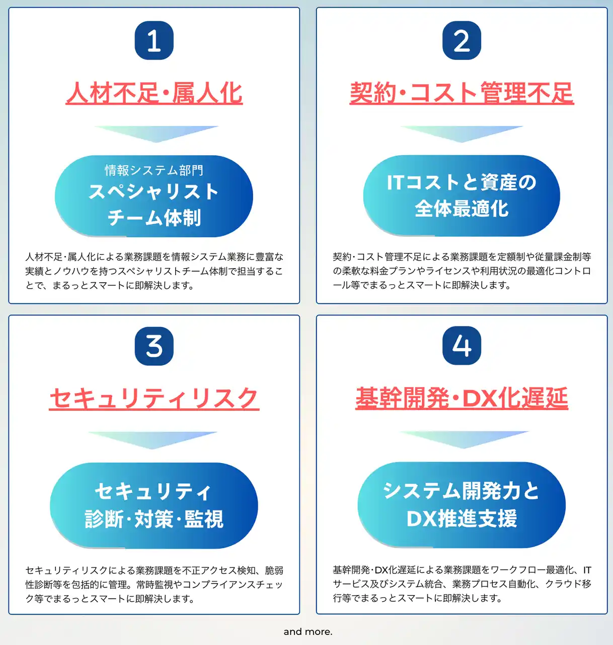 しかし、現状の日本企業においては、情報システム部門の「人材不足・属人化」、「契約・コスト管理不足」、「セキュリティリスク」、「基幹開発・DX化遅延」などの重要課題により、十分に推進できない状況にあります。 |