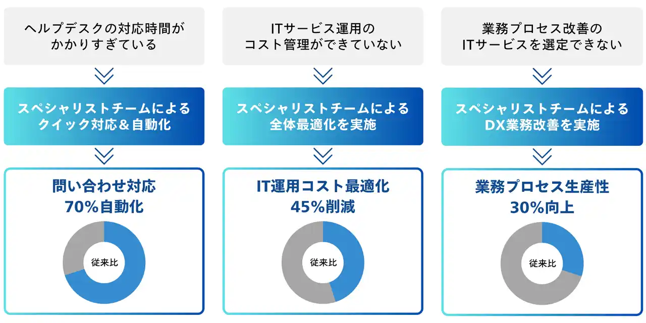 そこで、情報システム課題のソリューション「スマート情シス」の提供を開始しました。本サービスの導入により、スペシャリストチームが顧客企業の情報システム部門として、情報システム業務をまるっとスマートに課題を解決し、持続的な企業成長をワンストップで支援します。 |