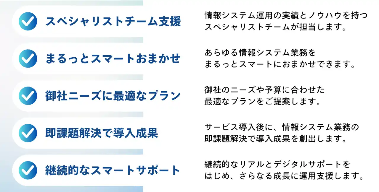 「スマート情シス」は、顧客企業の情報システム部門として、スペシャリストチームが企業ニーズに合わせたAI・DX導入活用による業務改革を安心安全にまるっとスマートに課題を解決し、さらなる成長に持続的にサポートし続けます。日本のAI・DX化に取り組んでまいります。どうぞご期待ください。 |