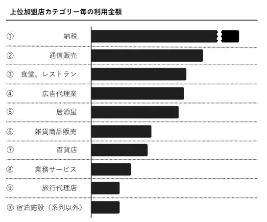 | 利用額上位の加盟店カテゴリは「通信販売(EC)」「レストラン」「広告代理業」。レストランや百貨店では比較的高単価の加盟店が目立つ傾向にあります。 | ||||||||||||||