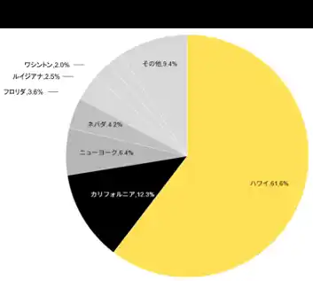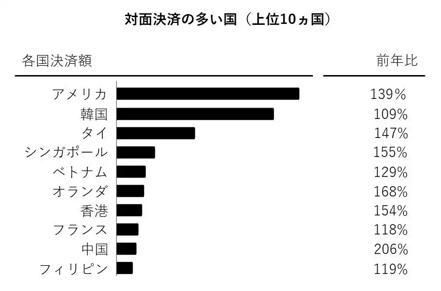| 海外の現地対面決済額は前年比131%と大きく増加しました。利用額の上位国はアメリカ(前年比139%)をはじめ太平洋圏やヨーロッパの国々で、昨年よりも決済額は増加傾向にあります。特にアメリカでの決済の過半(61.6%)をハワイが占め、ハレクラニやリッツカールトン、ハイアットなど高級ホテルでの利用が際立っているように、円安が続く中でも海外旅行への消費意向は高く維持されているとみられます。 | ||||||||||||||