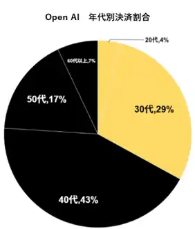 | OpenAIの取扱高は前年比542%となり、利用者数が大幅に伸長。年代別では、40代の利用額比率(43%)が若年層よりも高いのが特徴。年収別では3,000万円以上の層(29%)の利用が最も多く、経営者層のビジネスシーンにおける生成AIの実務活用などをはじめとして、アクティブなAI利用傾向が窺えます。 | ||||||||||||||