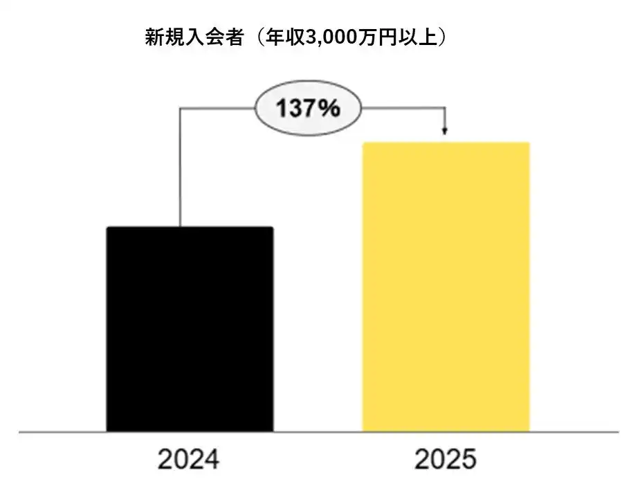 | 年収別の新規入会者では、年収3,000万円以上の層が前年比で137%の伸長。 | ||||||||||||||