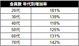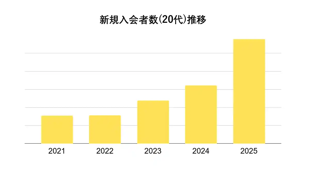 | 新規会員においては特に20代の入会が増加傾向にあり、年々その増加幅も拡大しています。 | ||||||||||||||