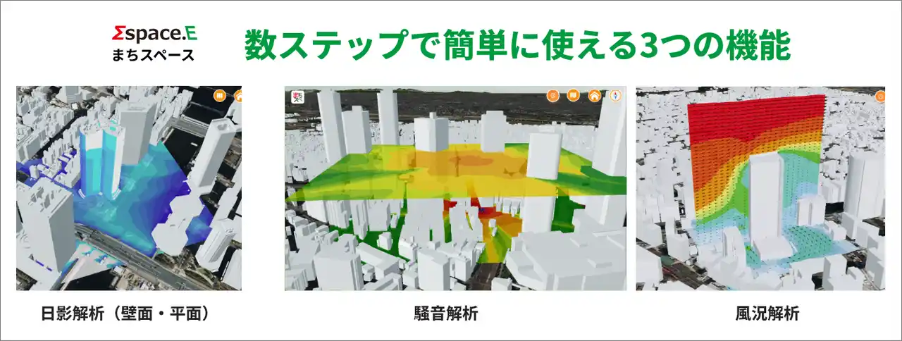 まちスペースは、「デジタルツインをだれもが使える」をコンセプトに作られたクラウド型の環境シミュレーションで、Webブラウザ上で手軽に日影・騒音・風況解析が行えます。 |