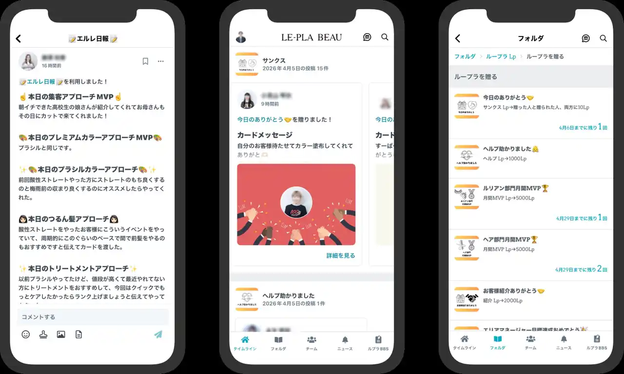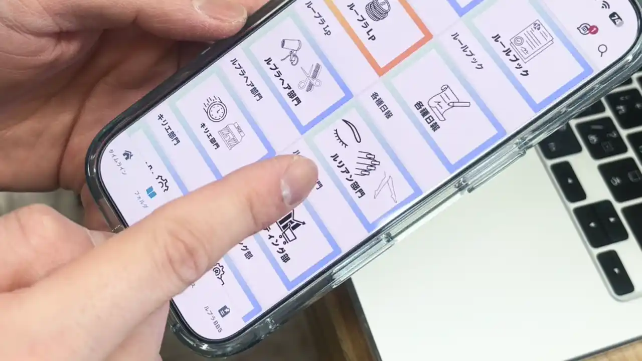 株式会社ルプラボウでは、正社員や時短社員に加え、美容学生のアルバイトなど多様なスタッフが各店舗で勤務しています。従来、店舗間の連絡は個人のSNSに依存しており、情報の散在やプライベートとの境界線が課題となっていました。 |