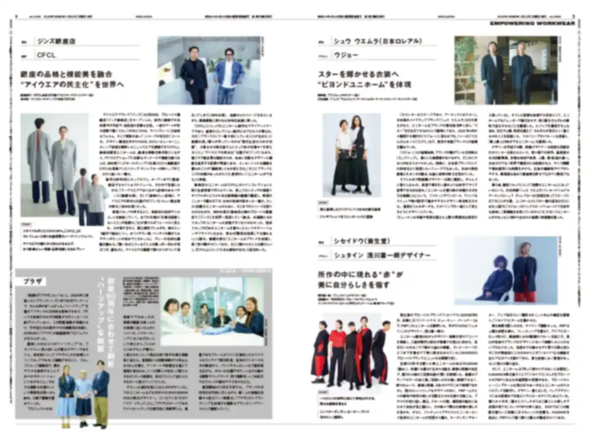 そのほかにも資生堂グローバルブランド「シセイドウ(SHISEIDO)」×「シュタイン(SSSTEIN)」浅川喜一朗デザイナー、「シュウ ウエムラ(SHU UEMURA)」×「ウジョー(UJOH)」、「ルナソル(LUNASOL)」×「ハルノブムラタ(HARUNOBUMURATA)」といったビューティブランドがファッションデザイナーとの協業で作る店頭スタッフの装いや、「エズミ(EZUMI)」の江角泰俊デザイナーが手掛け6年にわたり現場を支えるJALのユニホーム、川崎市 藤子・F・不二雄ミュージアムとユナイテッドアローズ(UNITED ARROWS)のコラボなど、ビューティ、飲食、航空、文化施設、引っ越し、ホテルまで業種を横断してユニホームの製作事例を取材しました。 |