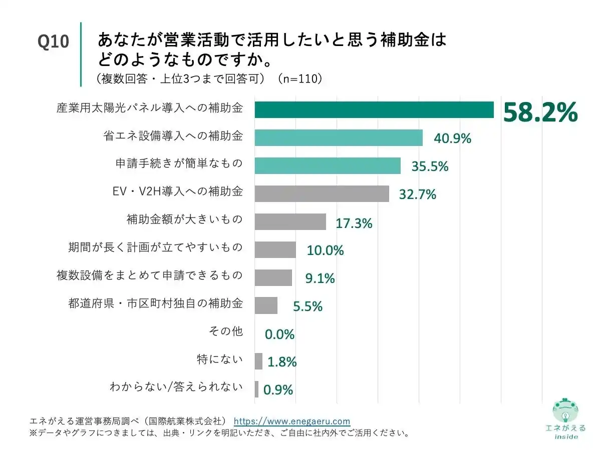 「Q10. あなたが営業活動で活用したいと思う補助金はどのようなものですか。(上位3つまで回答可)」(n=110)と質問したところ、「産業用太陽光パネル導入への補助金」が58.2%、「省エネ設備導入への補助金」が40.9%、「申請手続きが簡単なもの」が35.5%という回答になりました。 |