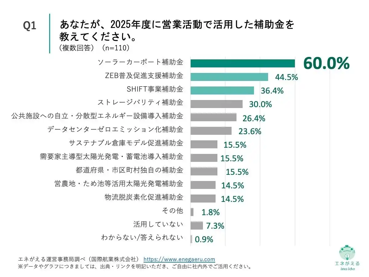 「Q1. あなたが、2025年度に営業活動で活用した補助金を教えてください。(複数回答)」(n=110)と質問したところ、「ソーラーカーポート補助金」が60.0%、「ZEB普及促進支援補助金」が44.5%、「SHIFT事業補助金」が36.4%という回答になりました。 |