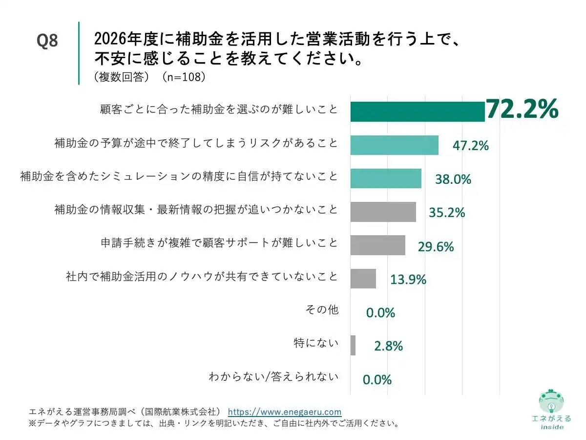 「Q8. Q4で「非常にそう思う」「ややそう思う」と回答した方にお聞きします。2026年度に補助金を活用した営業活動を行う上で、不安に感じることを教えてください。(複数回答)」(n=108)と質問したところ、「顧客ごとに合った補助金を選ぶのが難しいこと」が72.2%、「補助金の予算が途中で終了してしまうリスクがあること」が47.2%、「補助金を含めたシミュレーションの精度に自信が持てないこと」が38.0%という回答になりました。 |