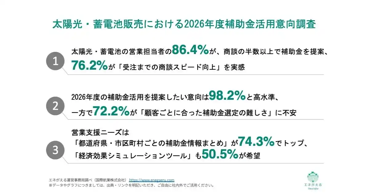 太陽光・蓄電池の経済効果診断「エネがえる(https://www.enegaeru.com/)」を提供する国際航業株式会社(本社:東京都新宿区、代表取締役社長:藤原 協)は、太陽光・蓄電池の販売施工店の営業担当者110名を対象に、太陽光・蓄電池販売における2026年度補助金活用意向調査を実施しましたので、お知らせいたします。