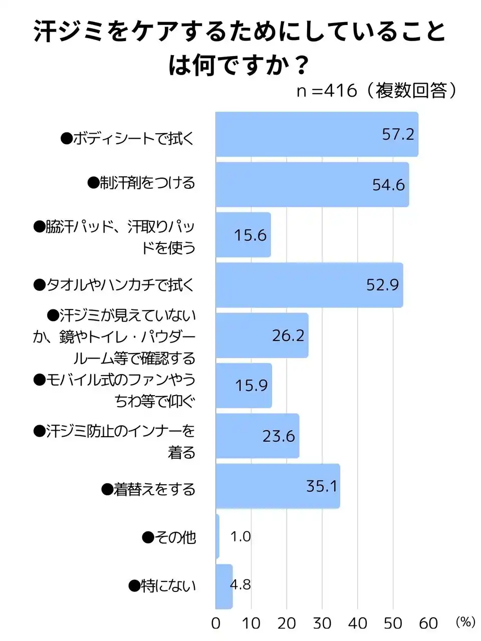 1位:「ボディシートで拭く」(57.2%)、2位:「制汗剤をつける」(54.6%)、3位「タオルやハンカチで拭く」(52.9%) |