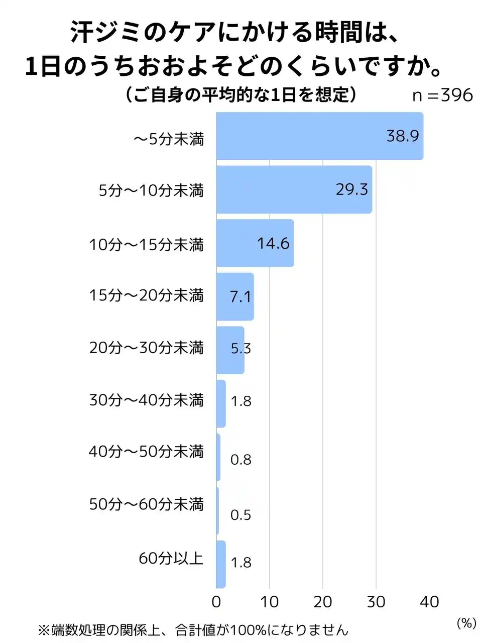汗ジミをケアする時間に1日10分以上費やしている人は全体の約3割にのぼりました。1日10分であっても、1ヶ月で約5時間になります。さらに、1日60分以上費やすと回答した人も1.8%おり、程度の差はあれど、多くの人が汗ジミ対策に一定の時間を費やしているという実態が判明しました。